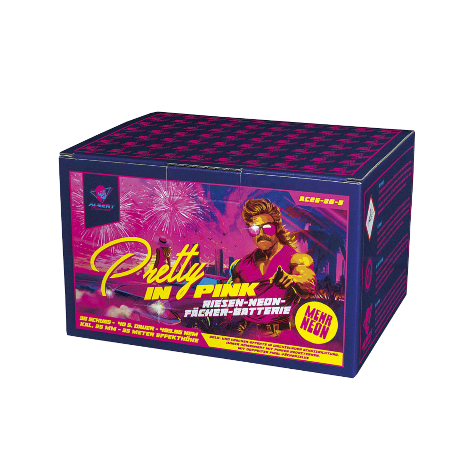 36 Schuss Batterie im Kaliber 25mm mit Gold- und Cracker-Effekten in wechselnder Schussrichtung, immer kombiniert mit pinken Neonsternen, mit doppelter Final-Fächersalve.